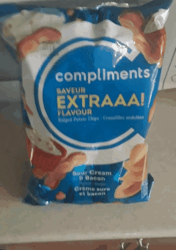 A bag of Compliments EXTRAAA! Sour Cream & Bacon Ridged Potato Chips.