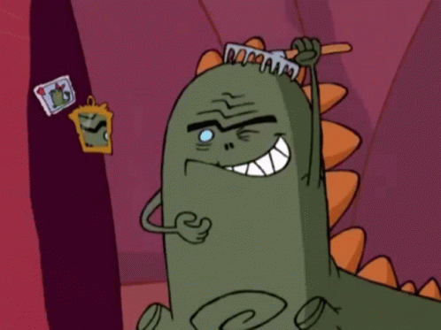Cartoon dinosaur from 'Potatoes And Dragons' combs its hair, winks, and gives a confident thumbs up.