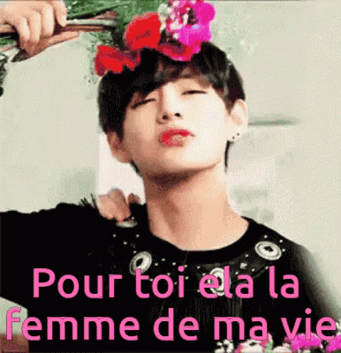 A man with a flower crown holds flowers, with the French text 'Pour toi Ela, la femme de ma vie' displayed.