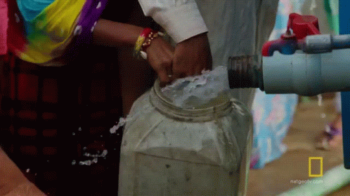 People filling a large container with water from a tap, highlighting the need for clean water, as seen on Nat Geo.
