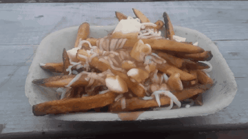 A close-up shot of a classic Canadian poutine dish, featuring crispy fries, melted cheese curds, and rich gravy.
