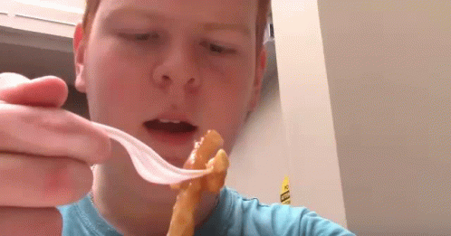 Raph Crafter eats poutine with a fork, then looks at the camera with a serious expression.
