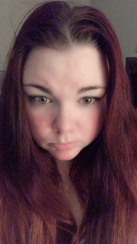 Woman with long red hair looking at the camera with a pouty expression and blinking.