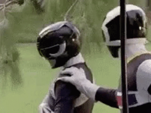 Two Power Rangers, including Monfrere, share a friendly handshake.