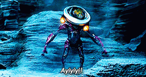 Power Rangers' Alpha 5 robot exclaims 'Ayiyiyi!' while standing on a rocky, alien landscape.