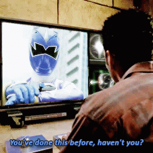 A man watches the Blue Ranger from Power Rangers Dino Thunder on a TV screen, with the caption 'You've done this before, haven't you?'