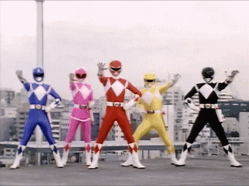 The Mighty Morphin Power Rangers strike iconic poses on a rooftop, showcasing their classic team formation.