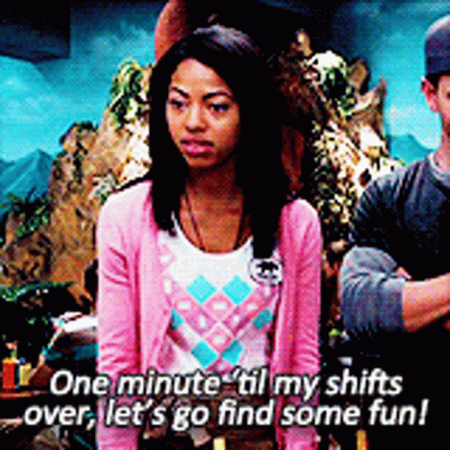 Shelby Watkins (Camille Hyde) from Power Rangers expresses excitement for fun as her shift is almost over.