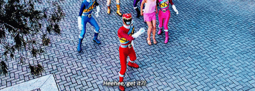 a group of power rangers are standing on a brick sidewalk and one of them is saying heehee get it