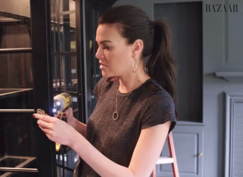Woman uses power tools to fix or install something, possibly a lock, in a Harper's Bazaar segment.