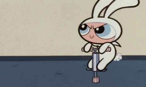 Bubbles, the Powerpuff Girl, in a white bunny costume, enthusiastically rides a pogo stick.