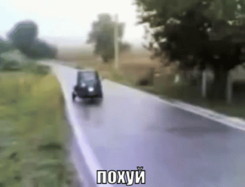 A small, three-wheeled truck, possibly a Piaggio Ape, drifts on a road with the Russian text 'похуй' (fuck it) overlaid.