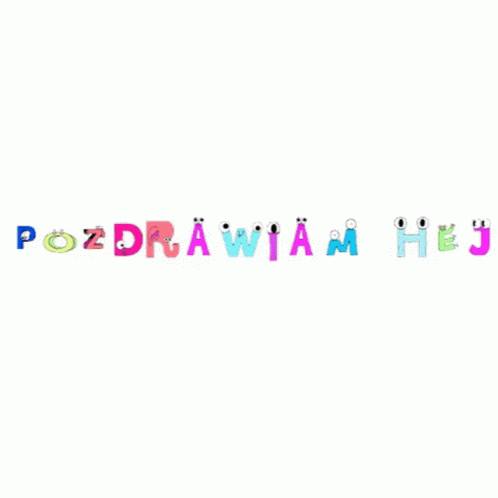 Animated colorful letters spell out 'Pozdrawiam Hej' with googly eyes, creating a playful greeting.