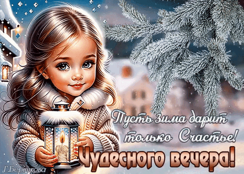 Cute little girl in a winter coat holding a glowing lantern, with a snowy fir branch and house in the background. Wishing happiness and a wonderful evening.