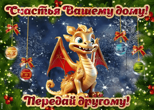 An animated golden dragon, symbol of 2024, surrounded by festive decorations with a Russian wish.