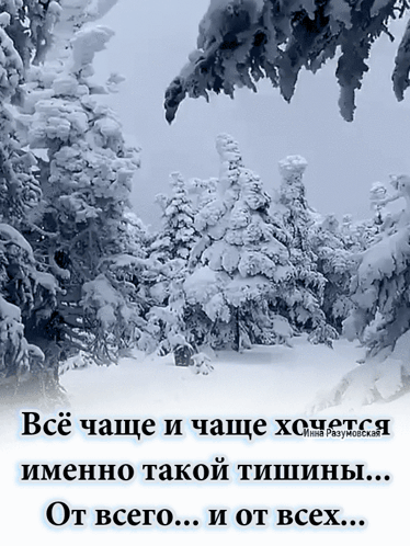 A serene snowy forest scene with a Russian message expressing a deep wish for silence and peace, away from everything.