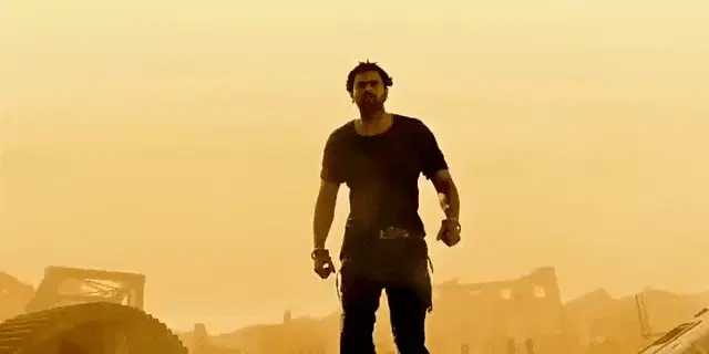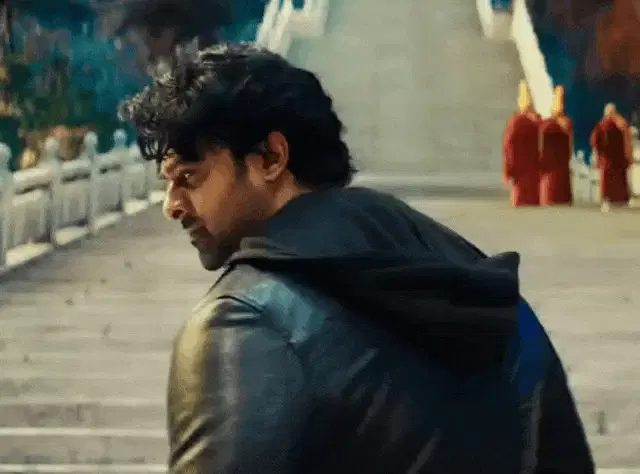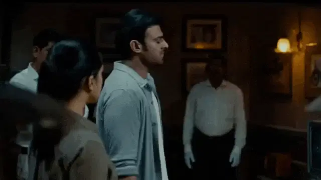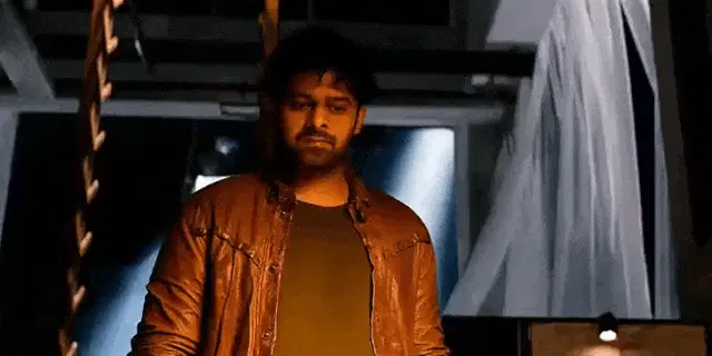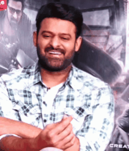 Actor Prabhas smiles during a promotional event for his film Saaho, wearing a plaid shirt.