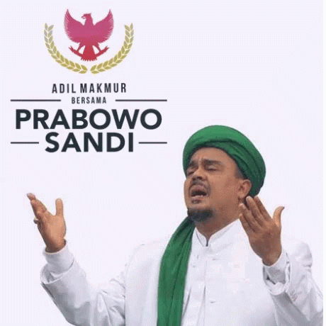 Habib praying for Prabowo Sandi, with 'Adil Makmur Bersama' slogan and Indonesian Garuda emblem.