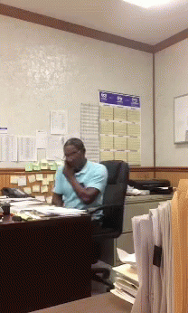 Man reacts to a prank call at his office desk, rubbing his head in frustration or amusement.