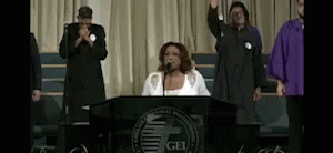 Kierra Sheard passionately leading prayer and shouting praise from a podium in a church, backed by a choir.