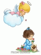 An angel on a cloud sends flying kisses while a little girl kneels in prayer with a puppy and flowers, from Connie.