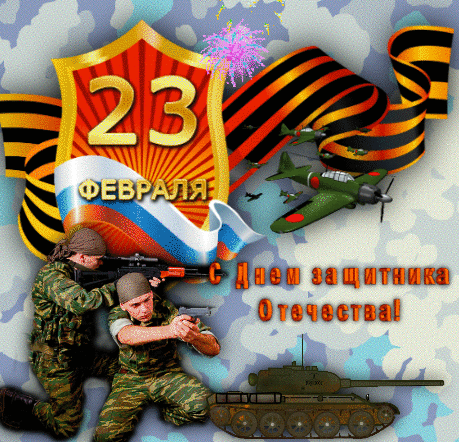 Two soldiers in camouflage, a tank, and fighter jets celebrate Defender of the Fatherland Day on February 23rd with a Russian flag.