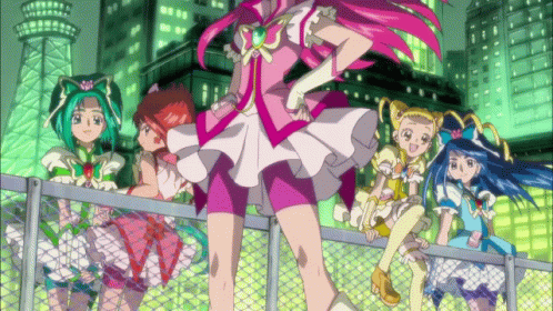 The Yes Precure 5 GoGo team, including Cure Dream, Cure Aqua, and others, strike heroic poses against a vibrant city skyline.