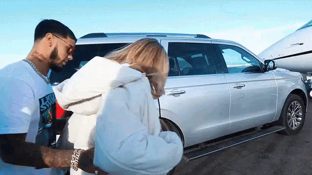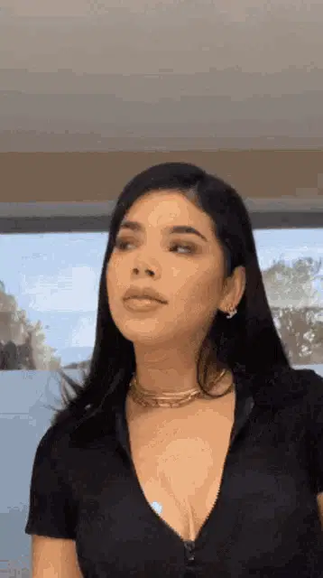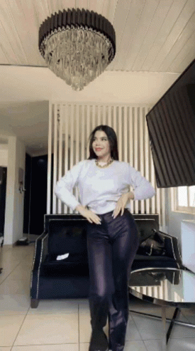 Kenia Os dancing in a stylish living room, wearing a white top and black pants, under a large chandelier.