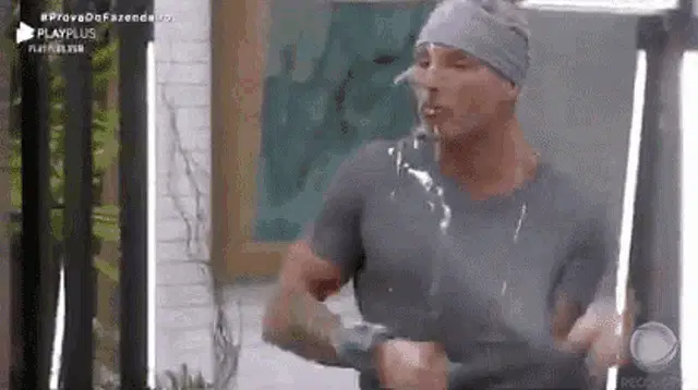 A woman from the reality show A Fazenda prepares to take an outdoor shower, making a funny face.
