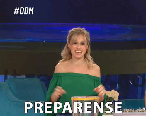 Mariana from El Diario De Mariana, excited and gesturing, says 'Preparense' while wearing a green off-the-shoulder top.