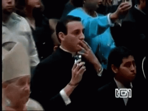 A priest in a black suit looks visibly shook and surprised during an event, reacting to an unseen moment.