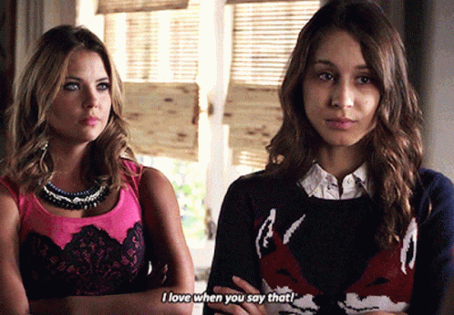 Hanna Marin (Ashley Benson) from Pretty Little Liars delivers her iconic line, 'I love when you say that!'.