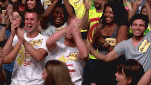 An excited crowd on The Price Is Right claps and cheers, with one person wearing an 'O'Neill' name tag.