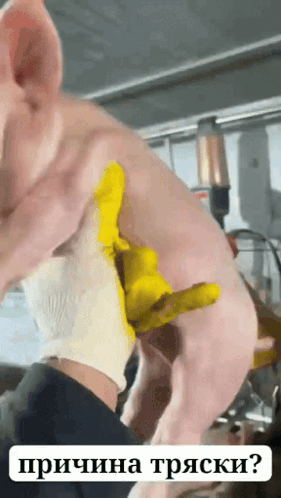 A person in yellow gloves holds a pig that is shaking, with Russian text asking the reason for its tremors.
