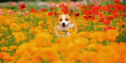 A happy corgi dog runs through a vibrant field of orange and red flowers, enjoying the spring season.