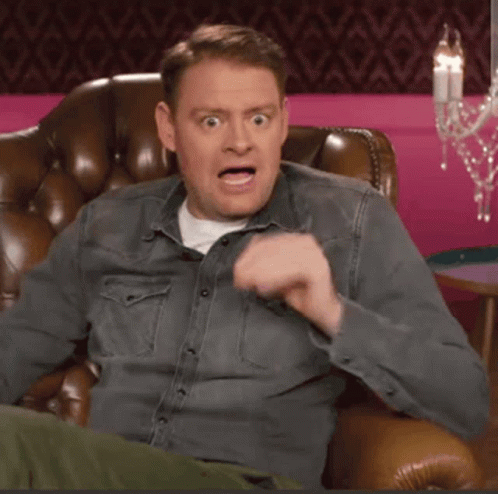 A man in a denim shirt reacts with wide eyes and an open mouth, then dramatically falls back into a brown leather armchair.