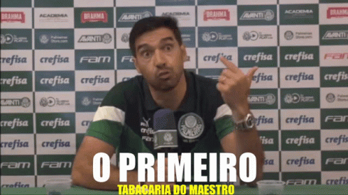 Abel Ferreira at a press conference, making a point with hand gestures, referencing the quote 'Primeiro Viste, Agora Não Viste'.