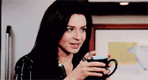Amelia Shepherd (Caterina Scorsone) sips coffee from a black mug, smiling in a plaid shirt.