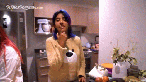 Karen Polinesia tastes something delicious in the kitchen, licking her finger after.
