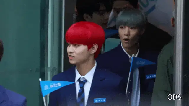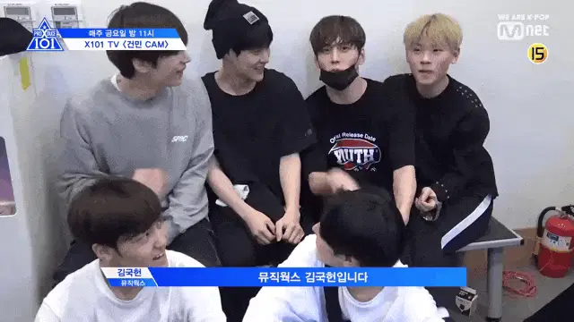 A contestant on Produce 101 reacts with a subtle nod and a thoughtful expression during a Super Junior performance.