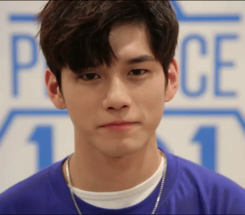A contestant from Produce 101 Season 2 looks directly at the camera, wearing a blue shirt and silver chain.