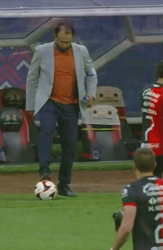 Profe Reynoso, coach of Cruz Azul, skillfully juggles a soccer ball on the field while M. Nervo watches.