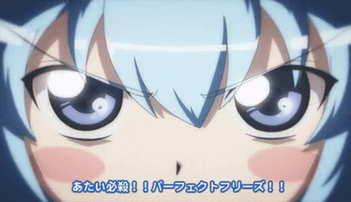 Cirno from Touhou Project unleashes her signature attack, "Perfect Freeze," with glowing eyes and a powerful stance.