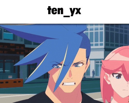 a cartoon of a man with blue hair and the words ten_yx below him