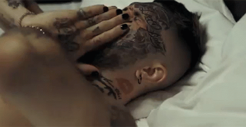 Russian rap artist Gunwest (Руслан Гоминов) waking up in bed, showing his distinctive face tattoos.