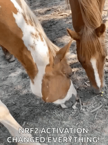 Two horses, one brown and white, the other brown, graze on grass with a caption about NRF2 activation.