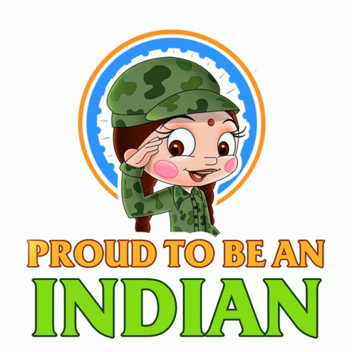 A cartoon girl in military uniform salutes, celebrating Indian Independence Day with the message 'Proud To Be An Indian'.