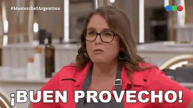 Joaquín Levinton, wearing a chef's hat and sunglasses, exclaims '¡Provecho!' on Masterchef Argentina.