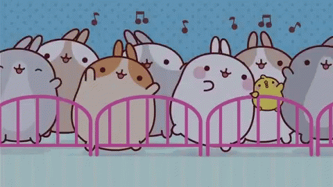 Molang and Piu Piu, along with other Molang Animals, sing joyfully behind a pink fence at a lively concert.