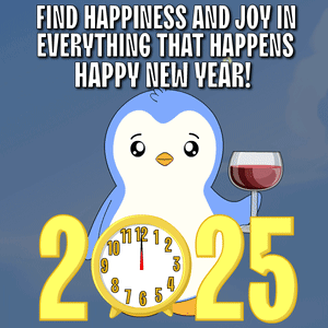 A cute Pudgy Penguin celebrates Happy New Year 2025 with a glass of wine and a clock.